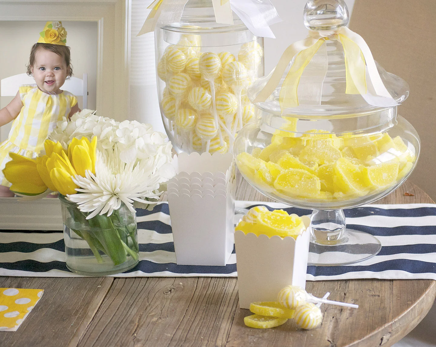 striped table runner - west elm | candy - amazon | white boxes - amazon | lanterns - shop sweet lulu | cake stands and serving ware - pottery barn | yellow striped straws - [similar] | water dispenser - z gallerie | drink bucket - world market | gold happy birthday banner - easy | gelato bowls - amazon | wooden gelato spoons - etsy | yellow checked dress - gap |