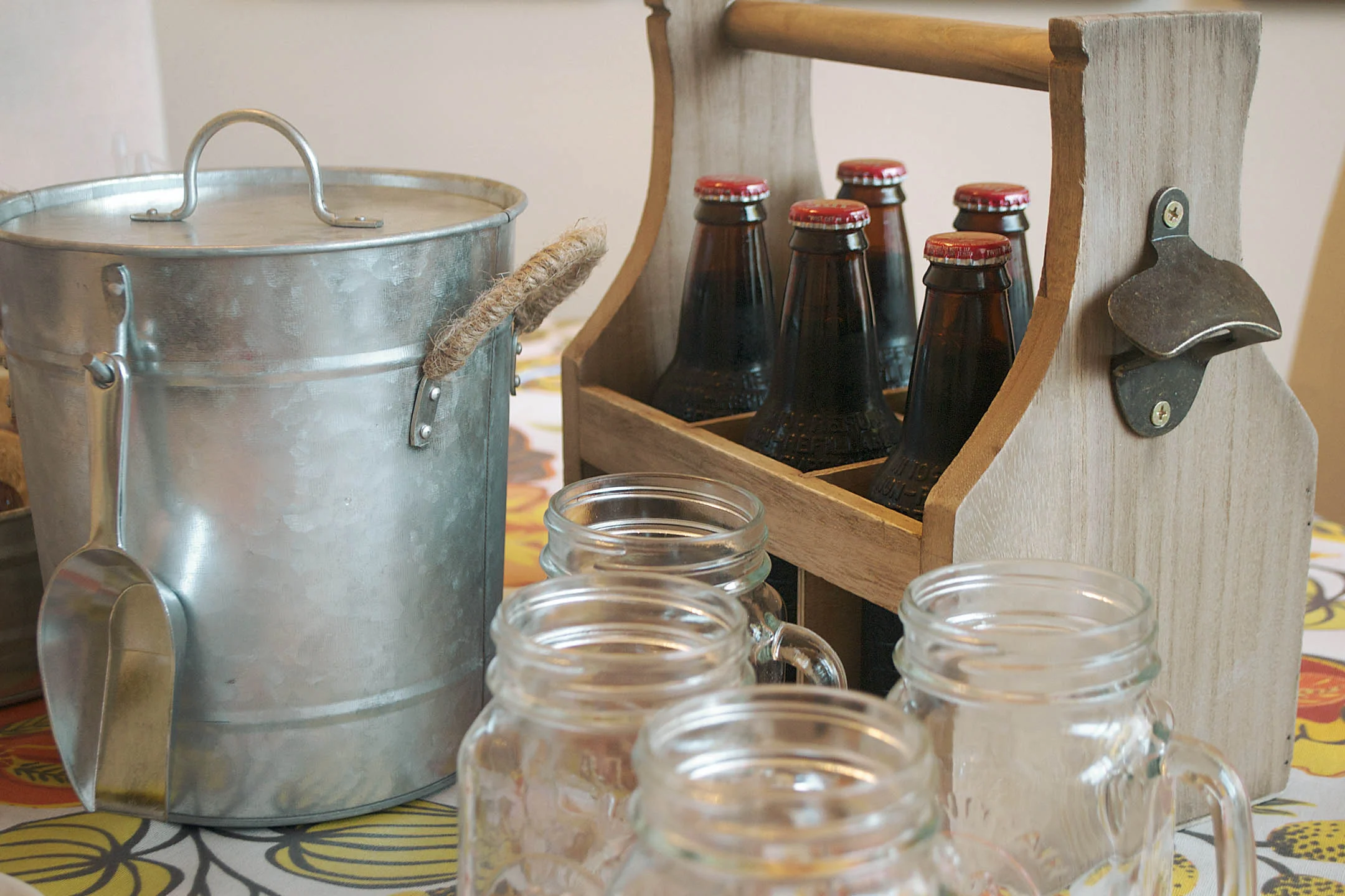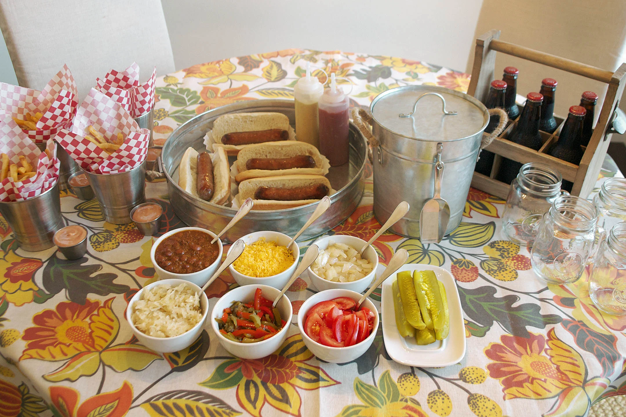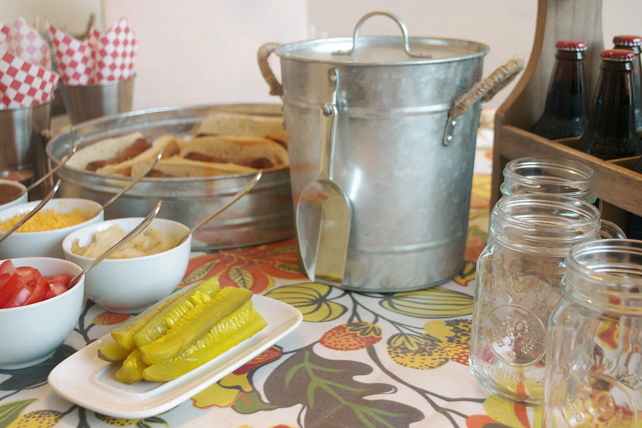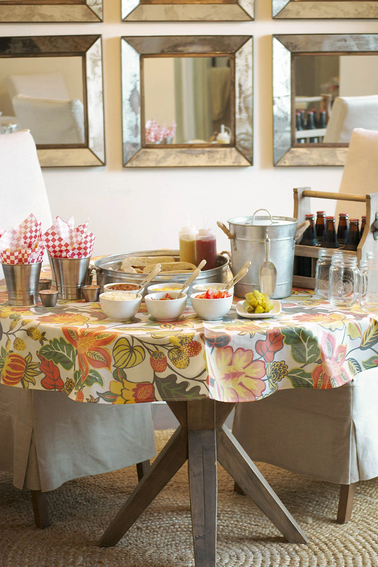 tablecloth - world market | french fry cups and liners - world market | galvanized tray - world market | sauce containers - world market | ice bucket - world market | glass mugs - pottery barn | bowls - pottery barn