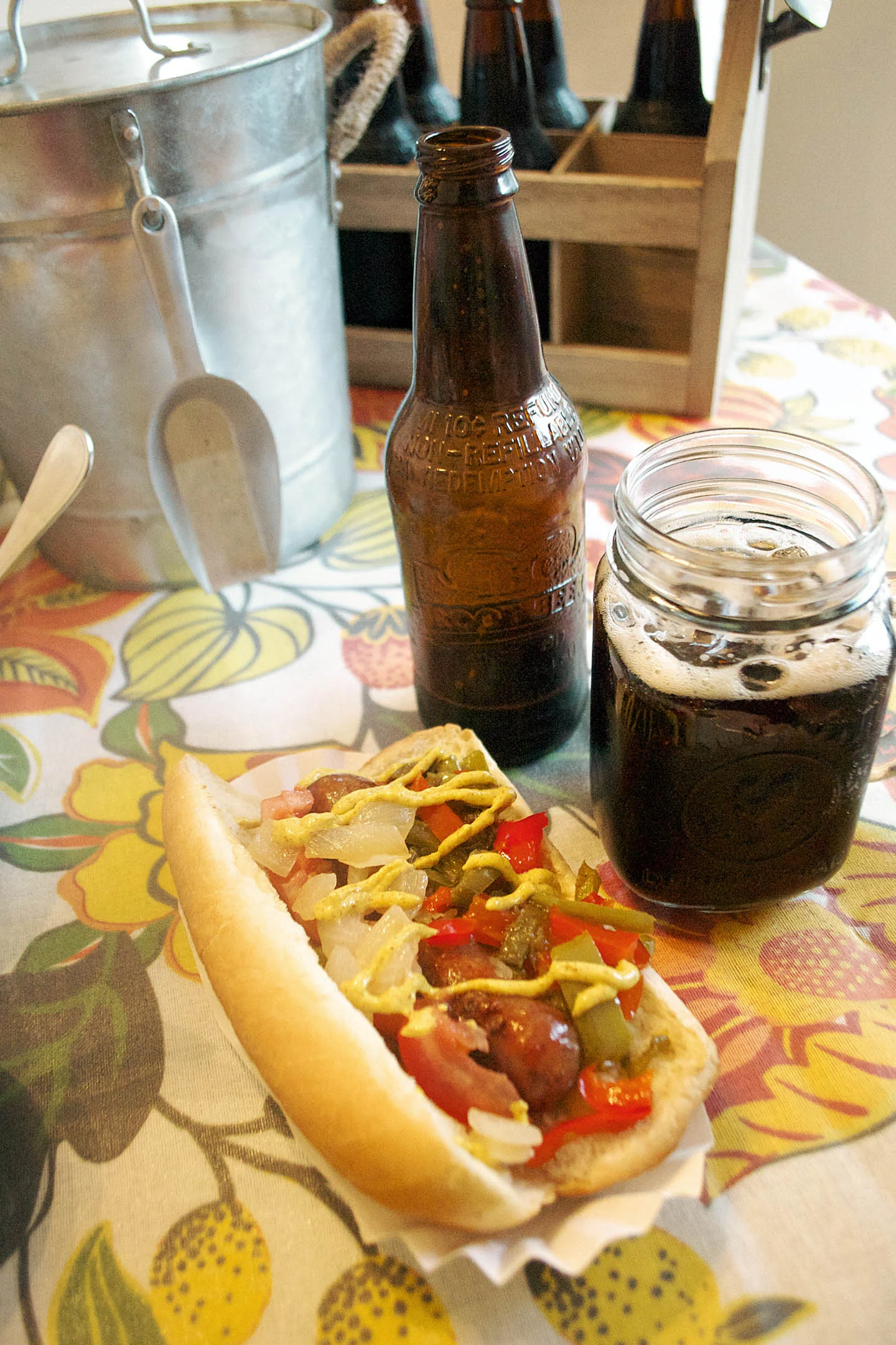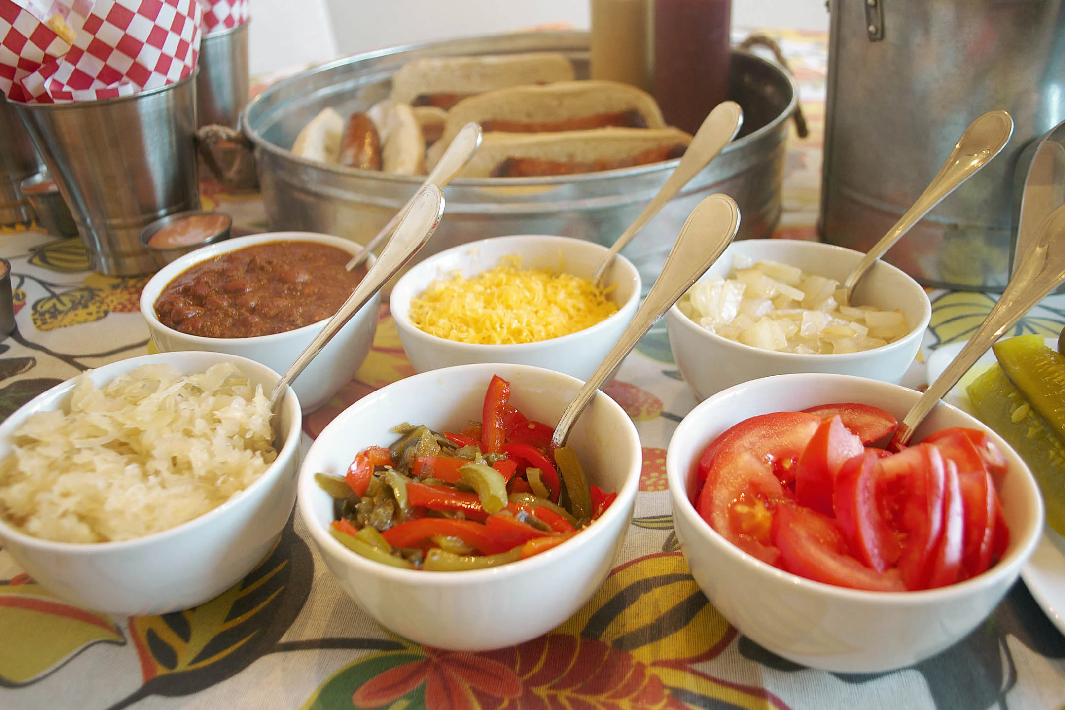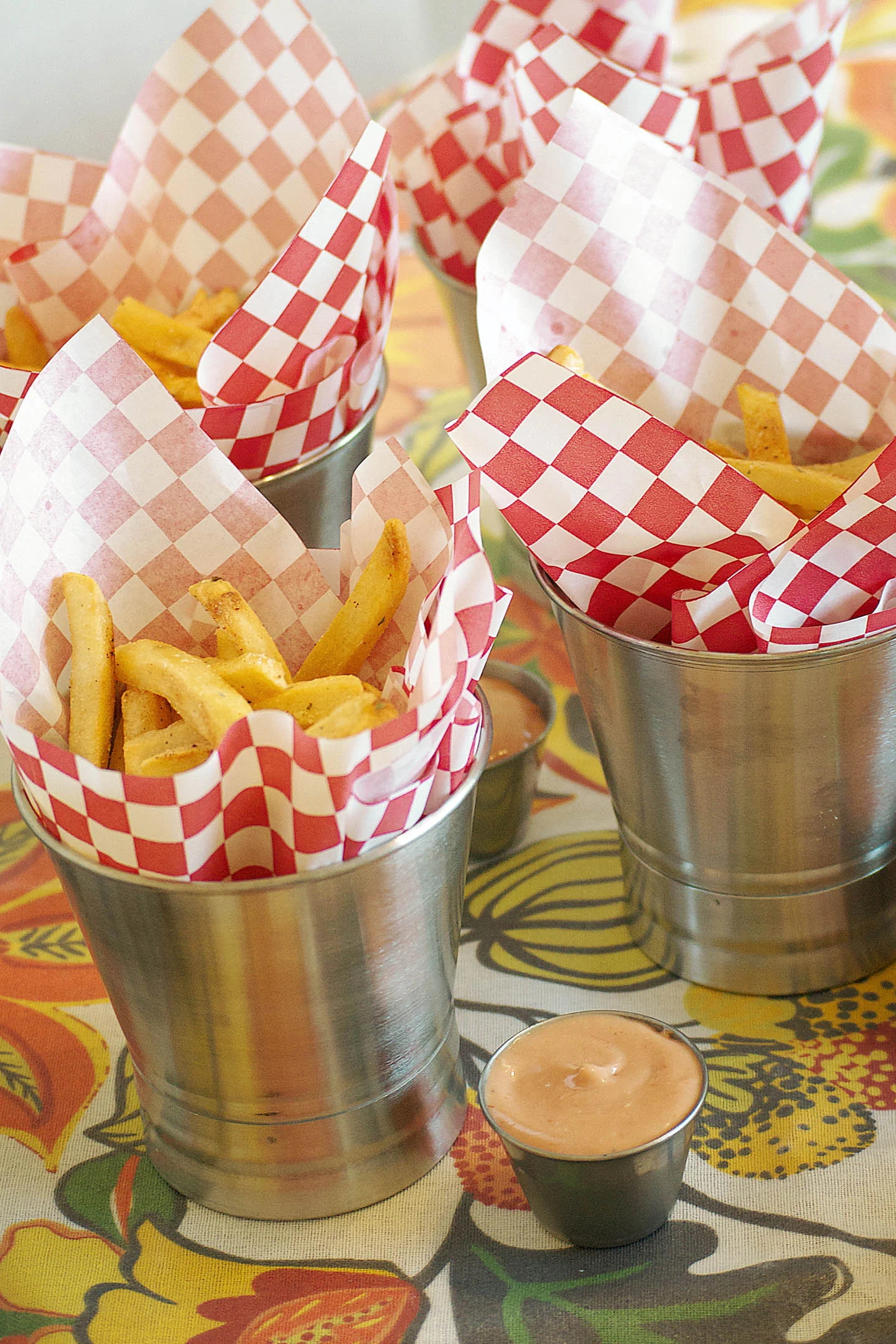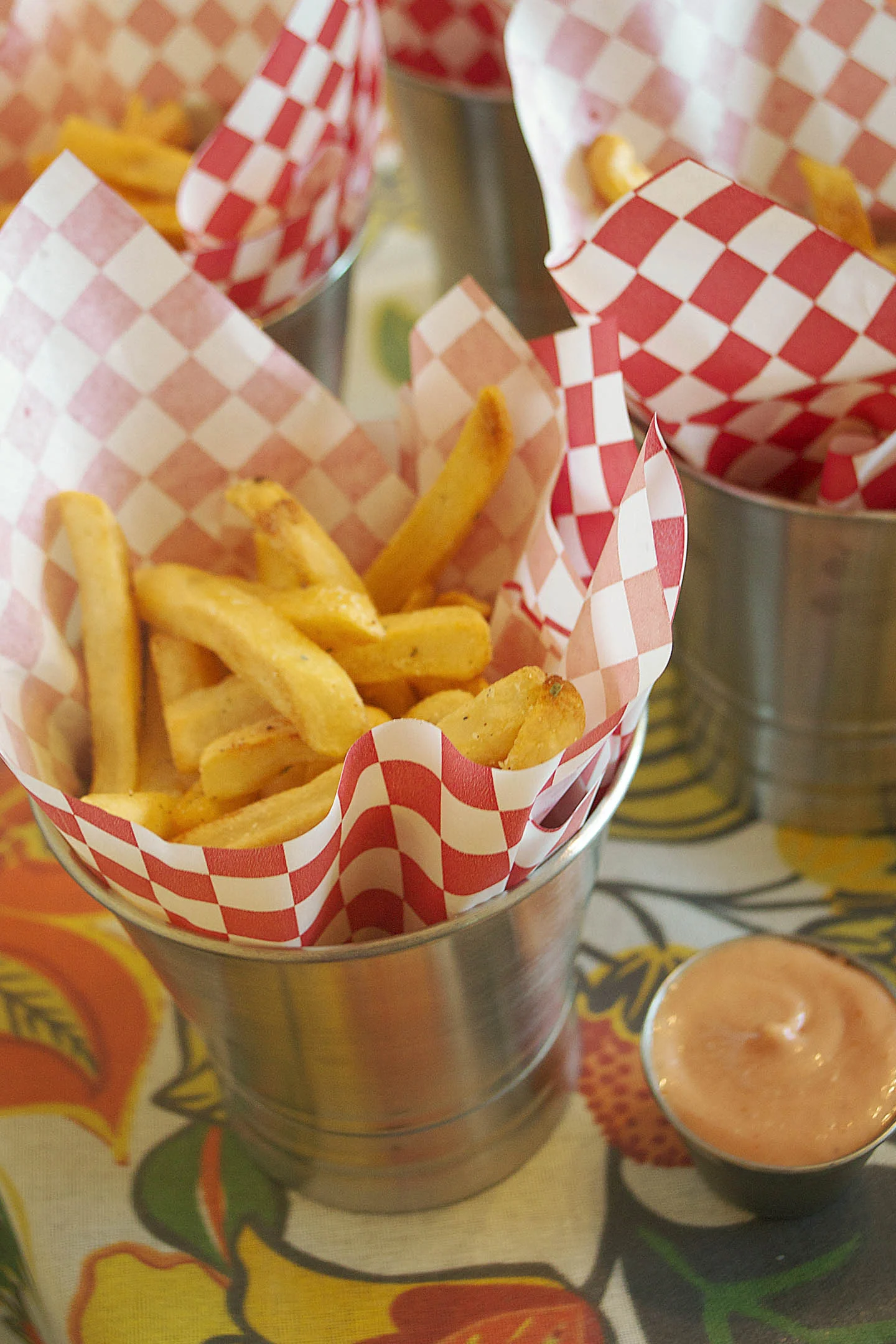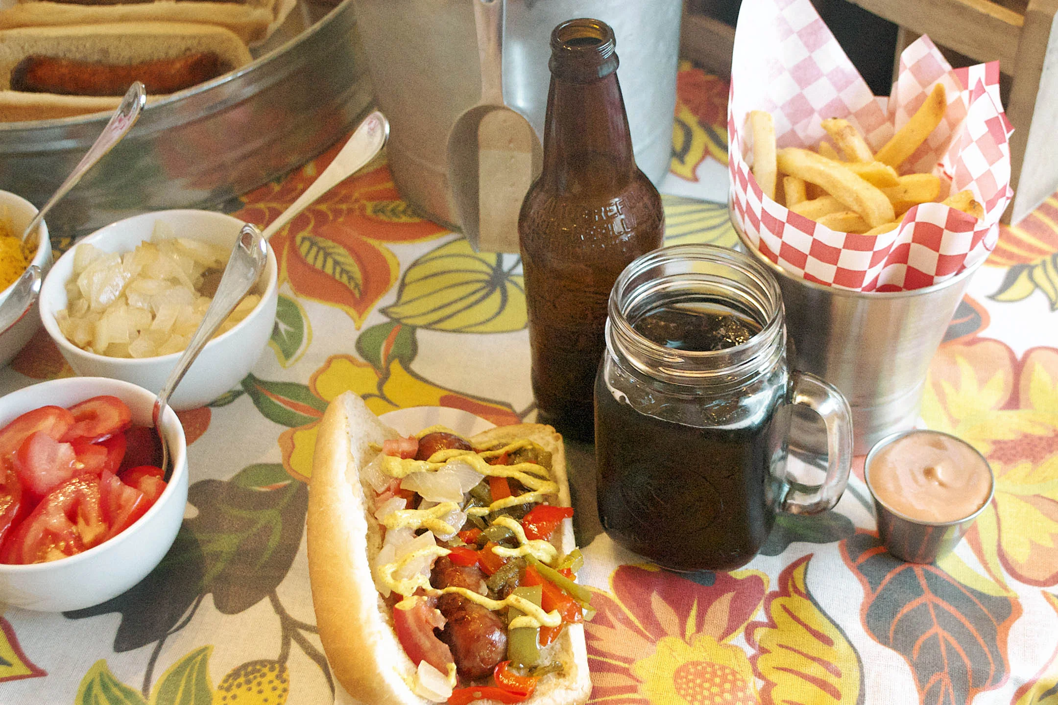 tablecloth - world market | french fry cups and liners - world market | galvanized tray - world market | sauce containers - world market | ice bucket - world market | glass mugs - pottery barn | bowls - pottery barn