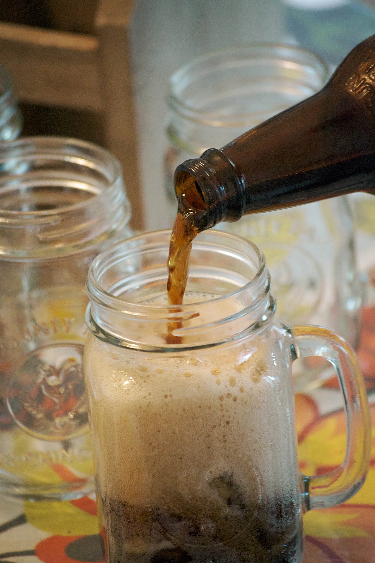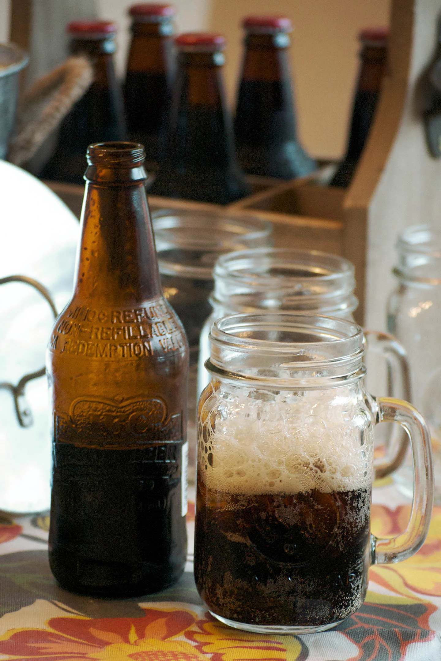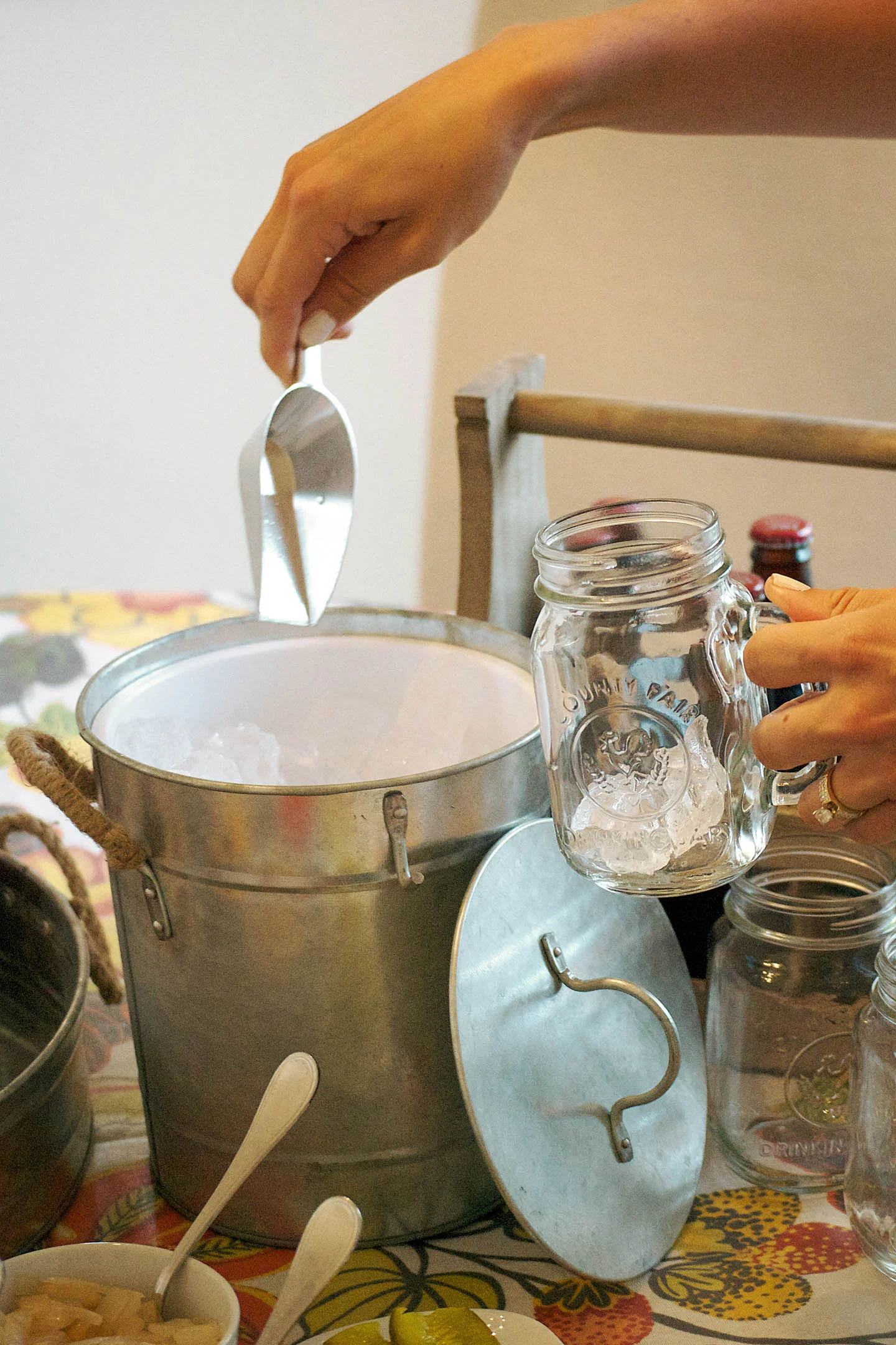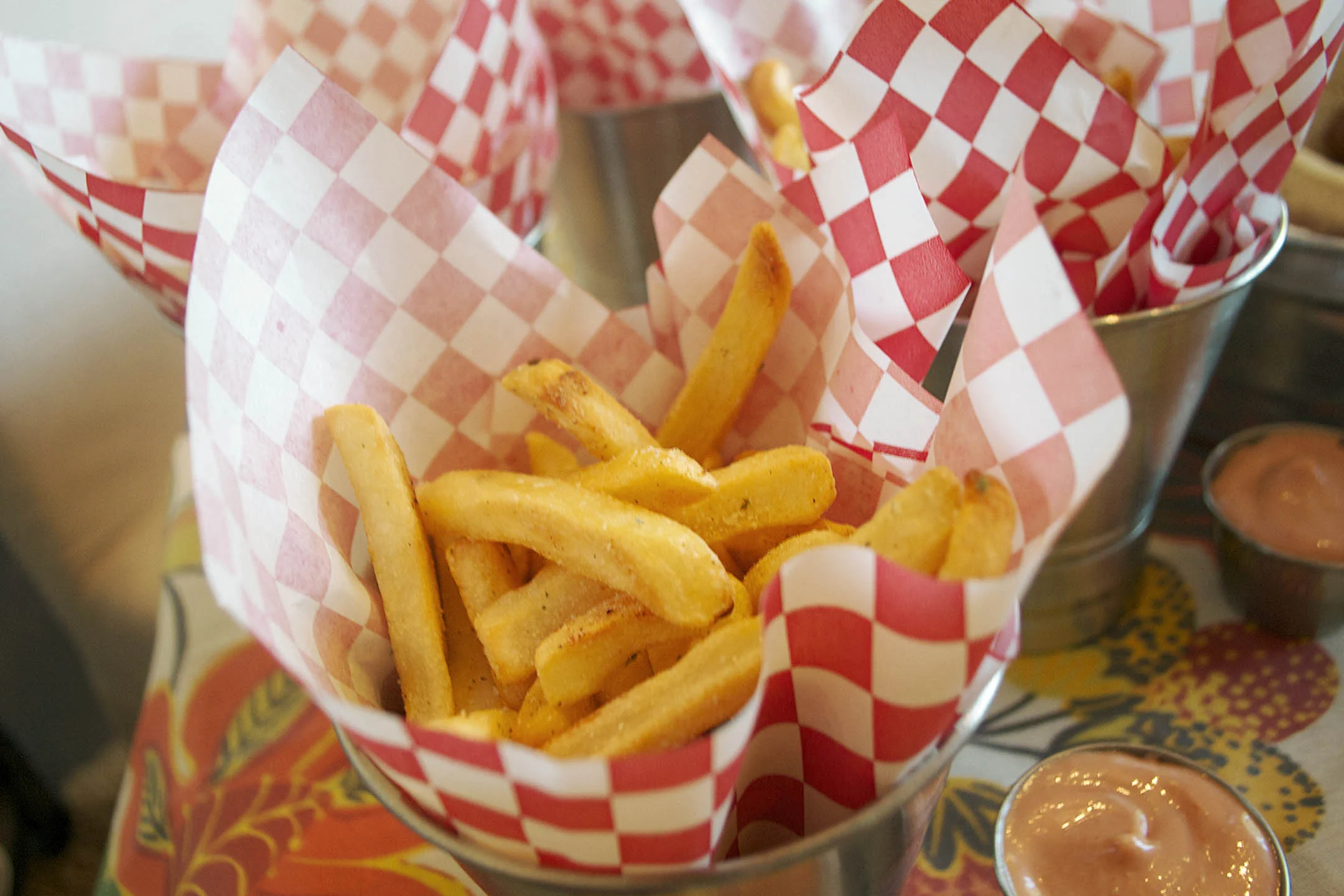 tablecloth - world market | french fry cups and liners - world market | galvanized tray - world market | sauce containers - world market | ice bucket - world market | glass mugs - pottery barn | bowls - pottery barn