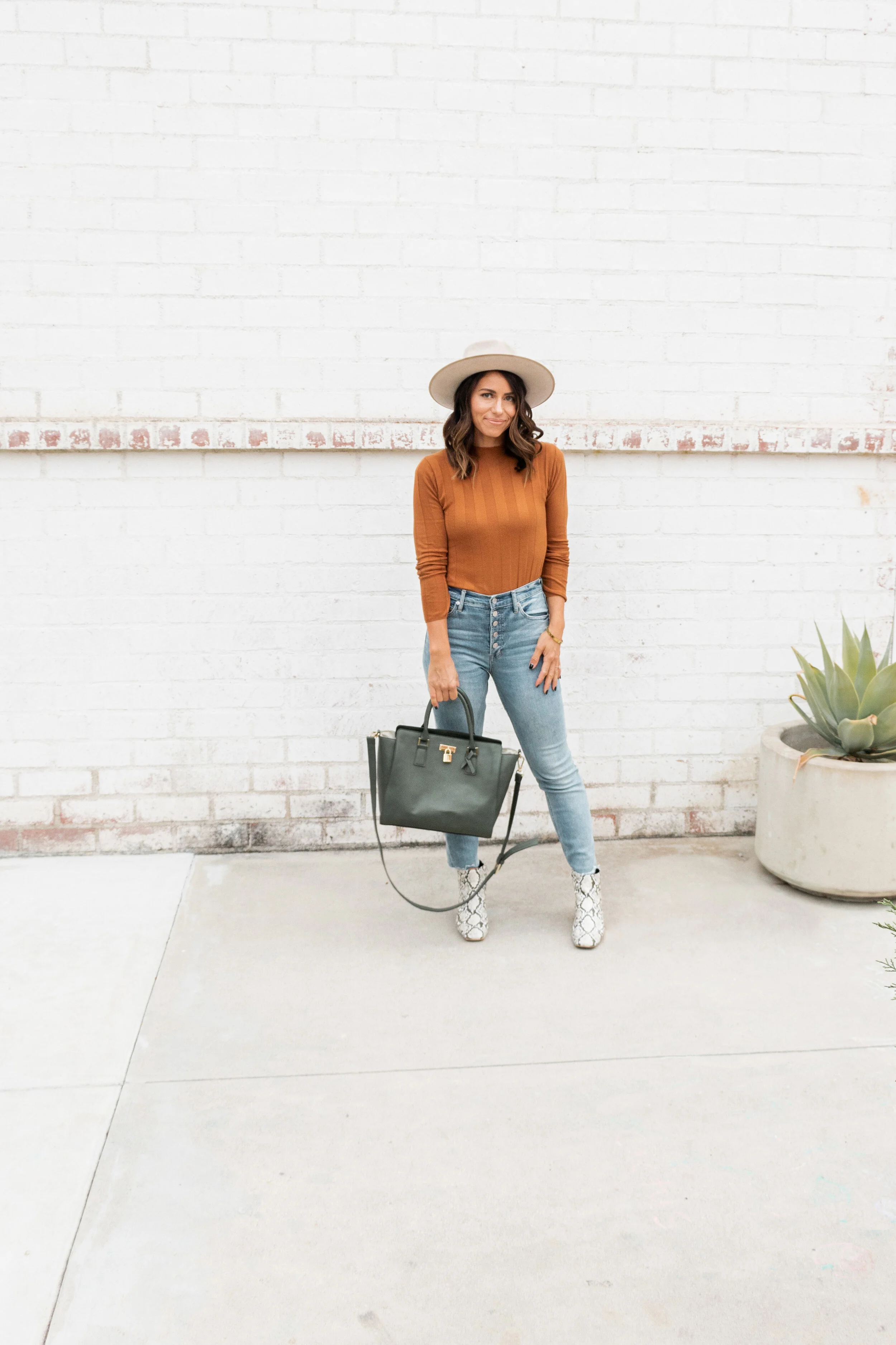 There’s a few things in my closet that have been on constant rotation lately because they are favorite pieces that go with everything. I’m all about building your favorite closet staples for the season and then rotating them through with different outfits. This wide-brim tan hat is a must because it’s just the perfect finishing touch to any outfit but also because it makes that dirty hair last all week long if you know what I mean. I’ve also been loving these ribbed long sleeve tees with the perfect mock neck, I would take one in every color as well as this sweater that’s the perfect length with high-waisted jeans. I’ve been sharing on my instagram how much I’ve been loving these snakeskin boots which I never thought I’d say because they seem like they wouldn’t go with much which in fact they look great with all the fall looks and rich shades of autumn. With these chilly mornings and warm afternoons we’ve been having I’ve learned how much I have to layer each day and this jacket has been the perfect thing to throw on.