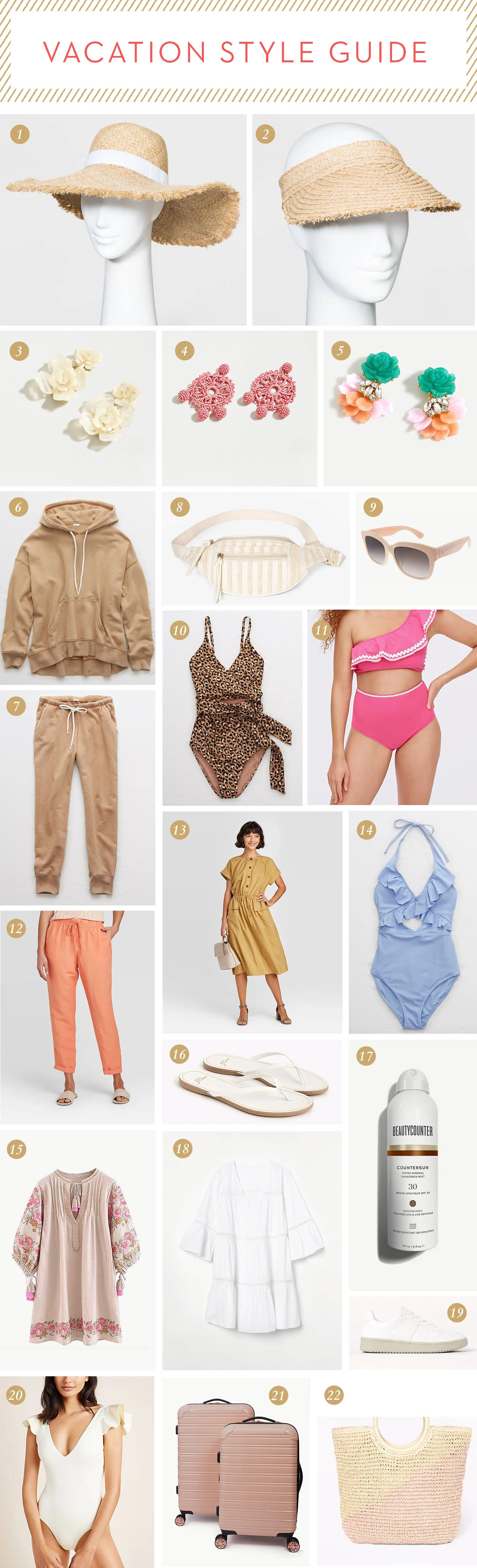 | 11 - pink ruffle two-piece | 12 - linen pants | 13 - comfy dress | 14 - blue ruffle one-piece suit | 15 - tunic coverup dress | 16 - leather flip flops | 17 - tinted sunscreen | 18 - white coverup | 19 - white sneakers | 20 - classic white swimsuit | 21 - luggage set | 22 - beach bag